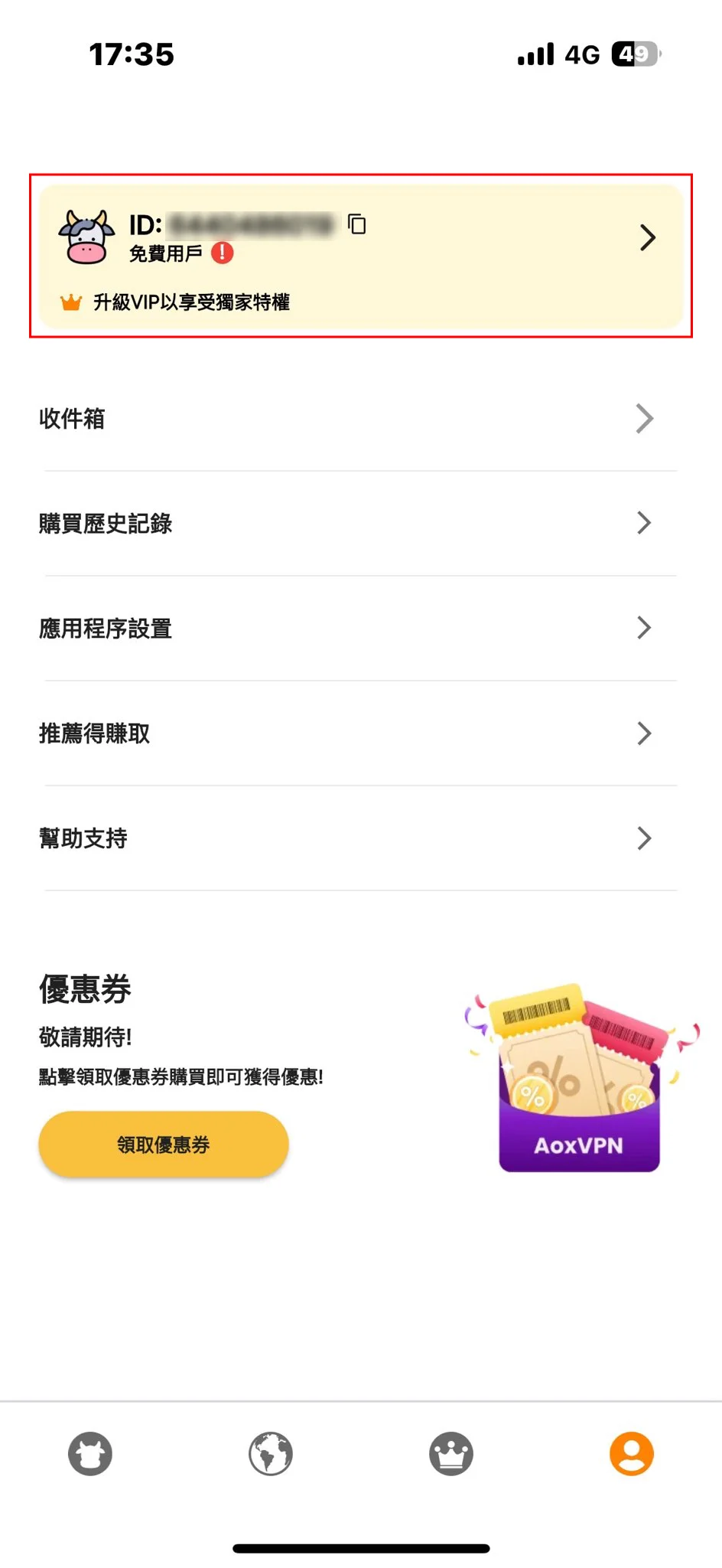 轉到您裝置上的小牛加速器應用程序,然後在帳戶頁面查看您的帳戶 ID。此帳戶 ID 與您的網站帳戶 ID 不同。點擊帳戶詳情橫幅進入帳戶設定頁面。